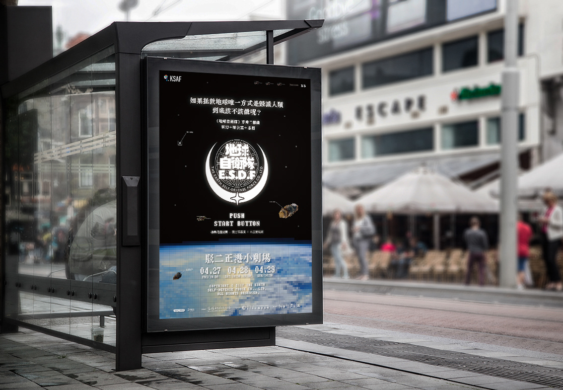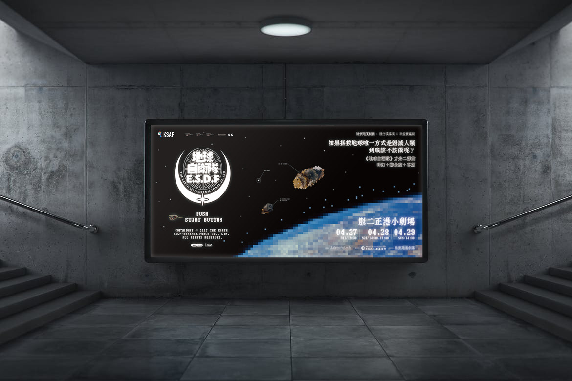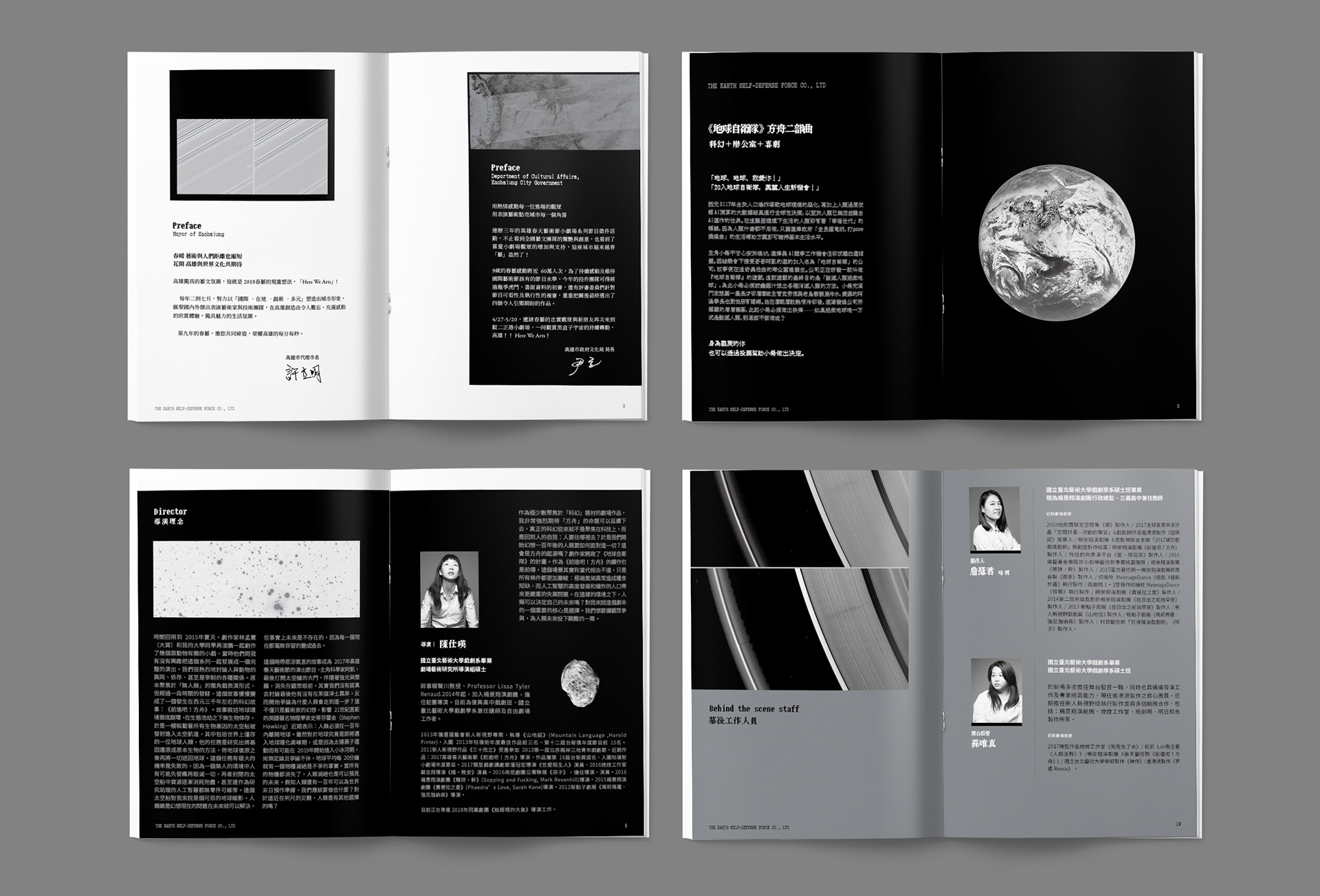 地球自衛隊為楊景翔演劇團的一場演出手冊,我負責該劇的整體平面視覺,礙於預算考量我以單色黑配上銀色的方式來呈現該手冊的質感,封面尺寸略小於內頁,並以黑色手感的紙張以網印的方式印白色,經由露出的內頁藉以增加封面的層次。
