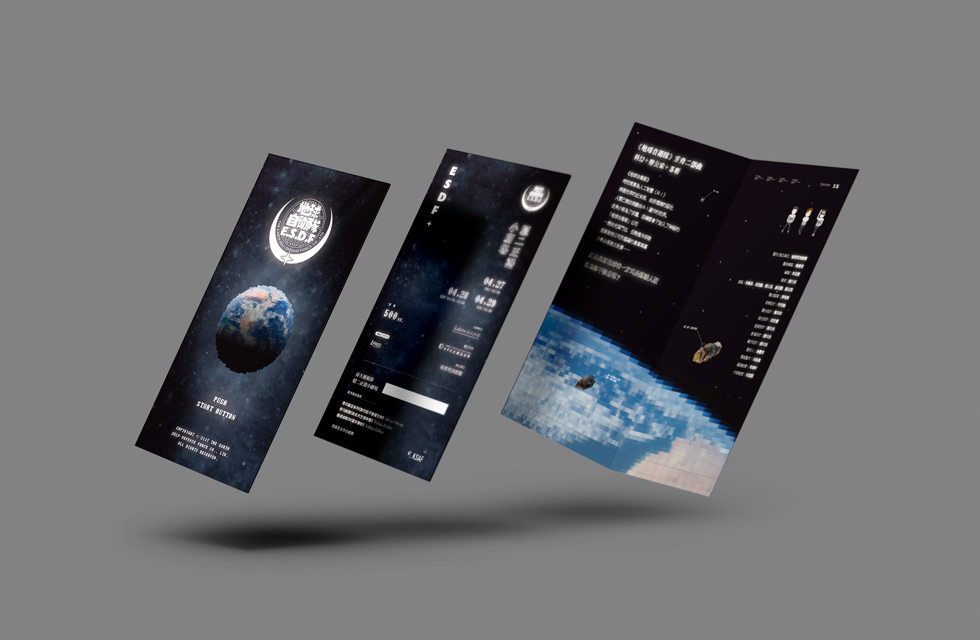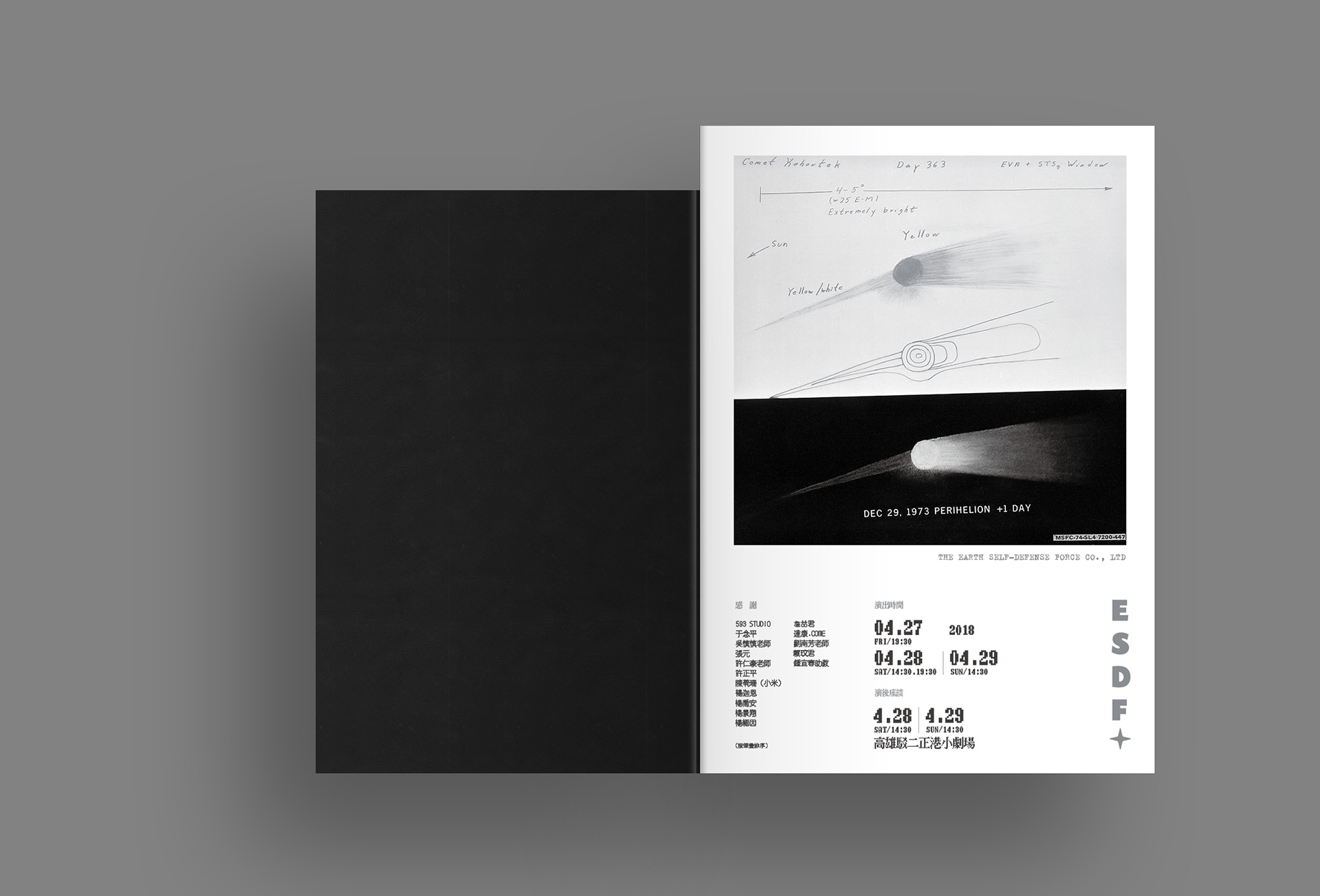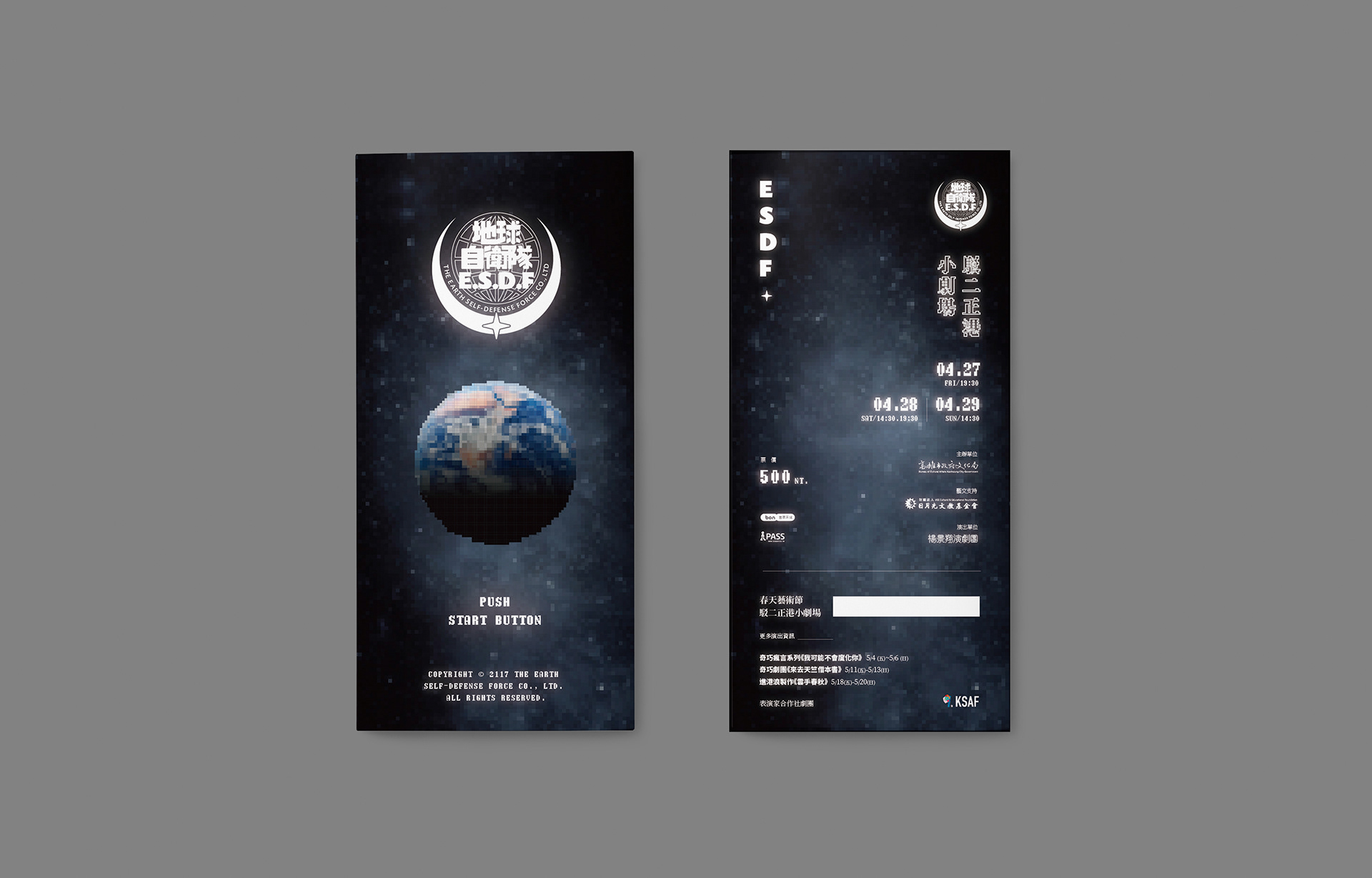 地球自衛隊為楊景翔演劇團的一場演出手冊,我負責該劇的整體平面視覺,礙於預算考量我以單色黑配上銀色的方式來呈現該手冊的質感,封面尺寸略小於內頁,並以黑色手感的紙張以網印的方式印白色,經由露出的內頁藉以增加封面的層次。